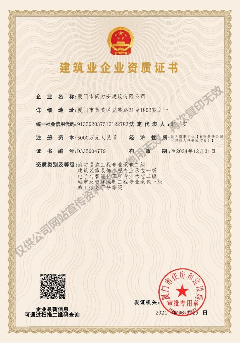 廈門市閩力安建設有限公司成立于2003年,公司取得市政公用工程施工總承包貳級、建筑裝修裝飾工程專業承包壹級、城市及道路照明工程專業承包壹級、電子與智能化工程專業承包貳級、消防設施工程專業承包貳級、電力工程施工總承包叁級、建筑機電安裝工程專業承包叁級、輸變電工程專業承包叁級、環保工程專業承包叁級、照明工程設計專項甲級、建筑裝飾工程設計乙級、施工勞務等資質的綜合型企業,公司于2013年通過了ISO9001質量體系認證,ISO14001環境管理體系認證,OHSAS18001職業健康安全管理體系認證。